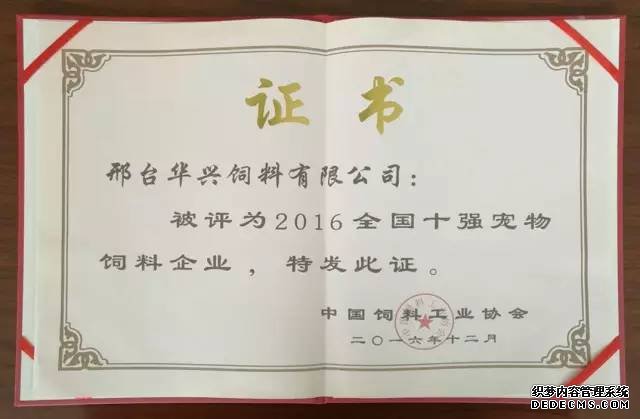 2016年12月9日,中國飼料工業(yè)協(xié)會(huì)第七次會(huì)員代表大會(huì)在北京召開,會(huì)議對2016年度中國飼料工業(yè)協(xié)會(huì)先進(jìn)集體及先進(jìn)工作者進(jìn)行了表彰, 華興公司榮獲“2016全國十強(qiáng)寵物飼料企業(yè)”稱號。
